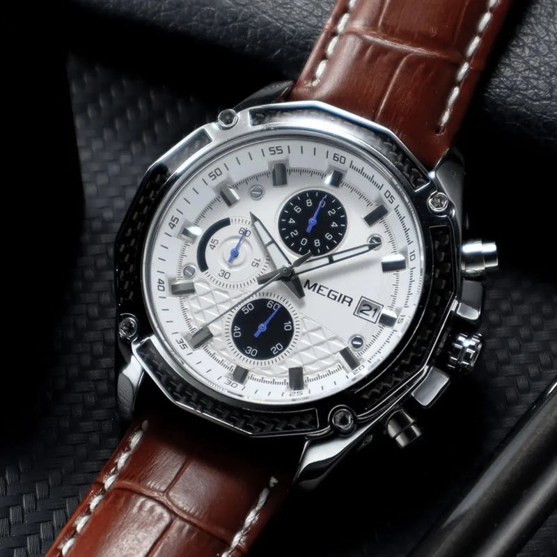 The Marchier Aether Watch was crafted for men who balance elegance with power. Its detailed chronograph subdials, luminous hands, and bold silhouette merge functionality with a confident aesthetic. Whether in motion or at rest, the Aether captures the rhythm of modern ambition.