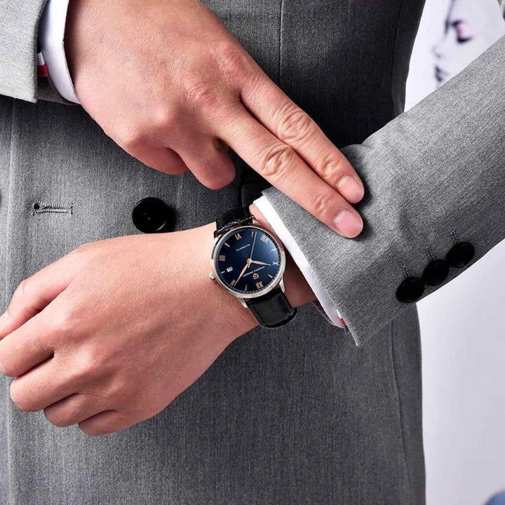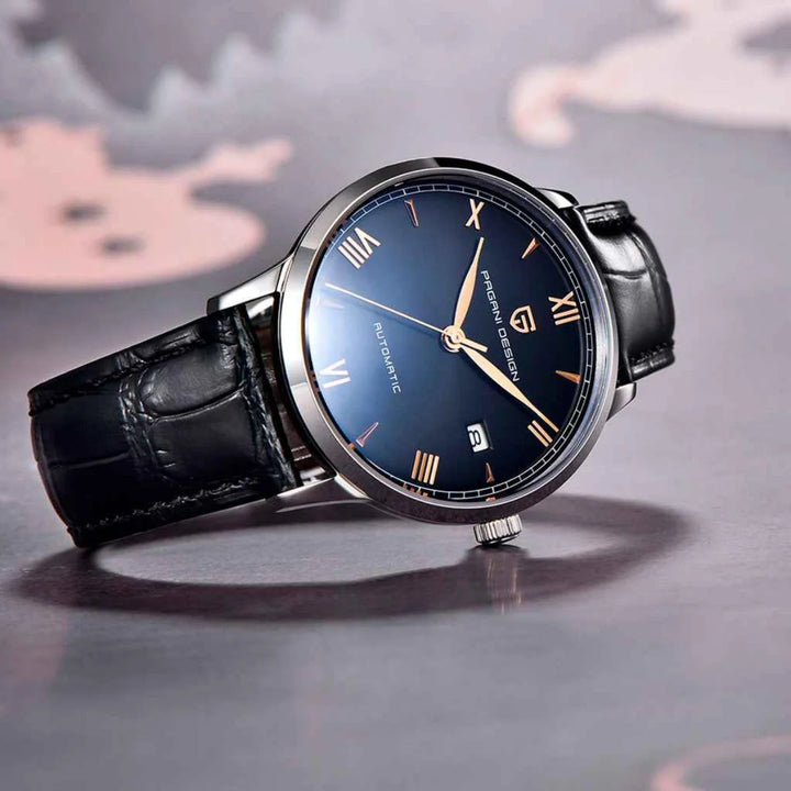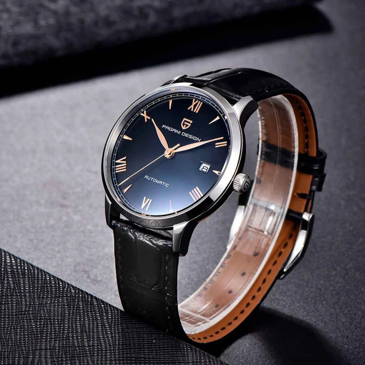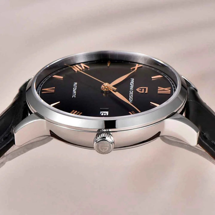 The Marchier Cain Black embodies refined elegance with a deep black dial and gold Roman numeral markers. With 100m water resistance, it ensures confidence in every setting.