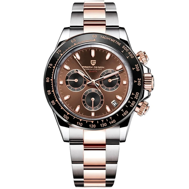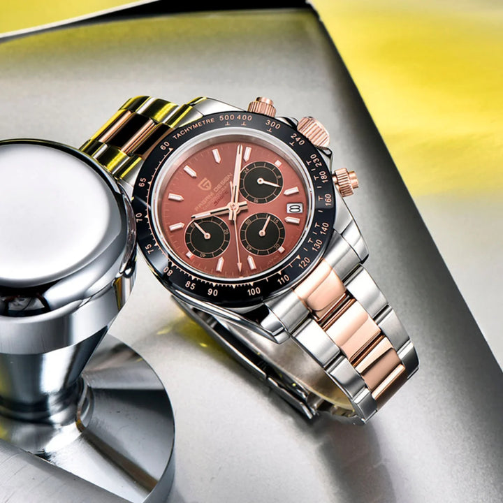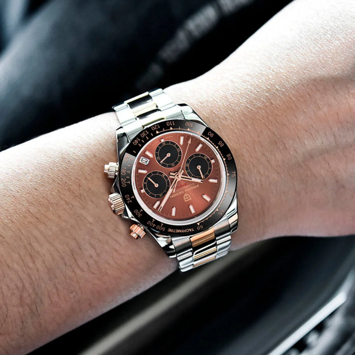 The Marchier Chrono Copper combines refined design with reliable functionality. With 100m water resistance, it ensures confidence in every setting.