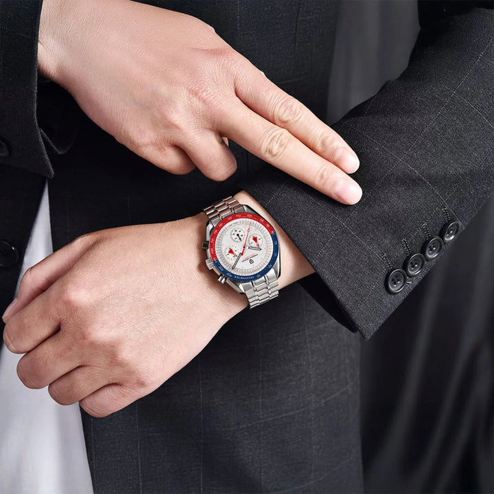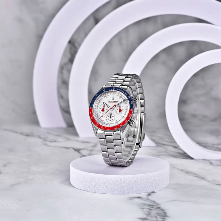The Marchier Chrono Red & Blue fuses daring aesthetics with precision. With 100m water resistance, it offers confidence from business to leisure.