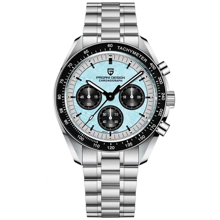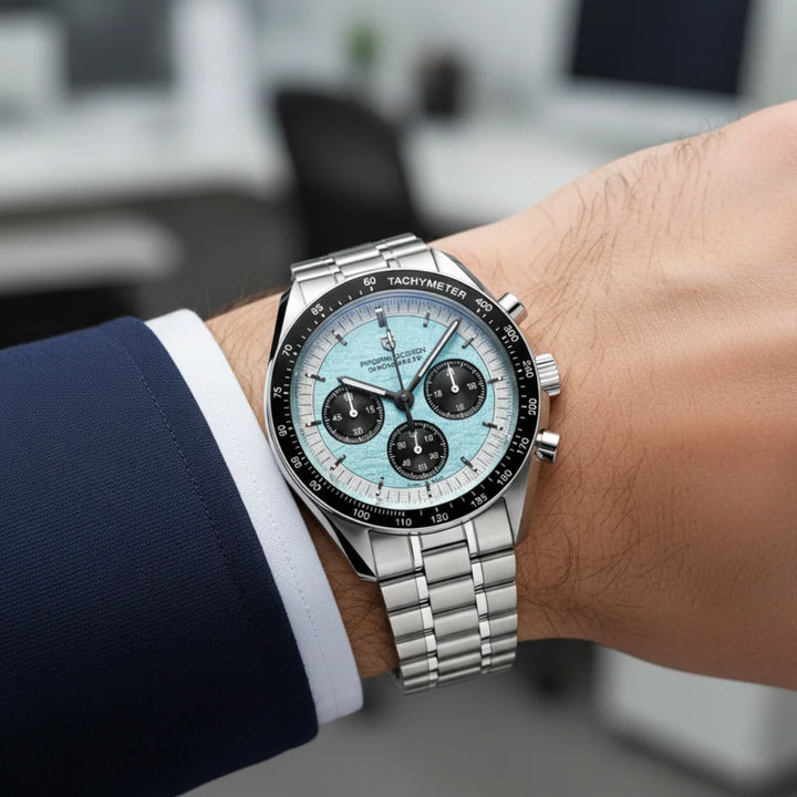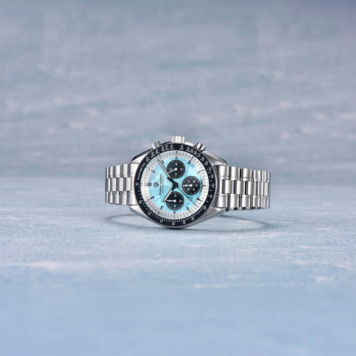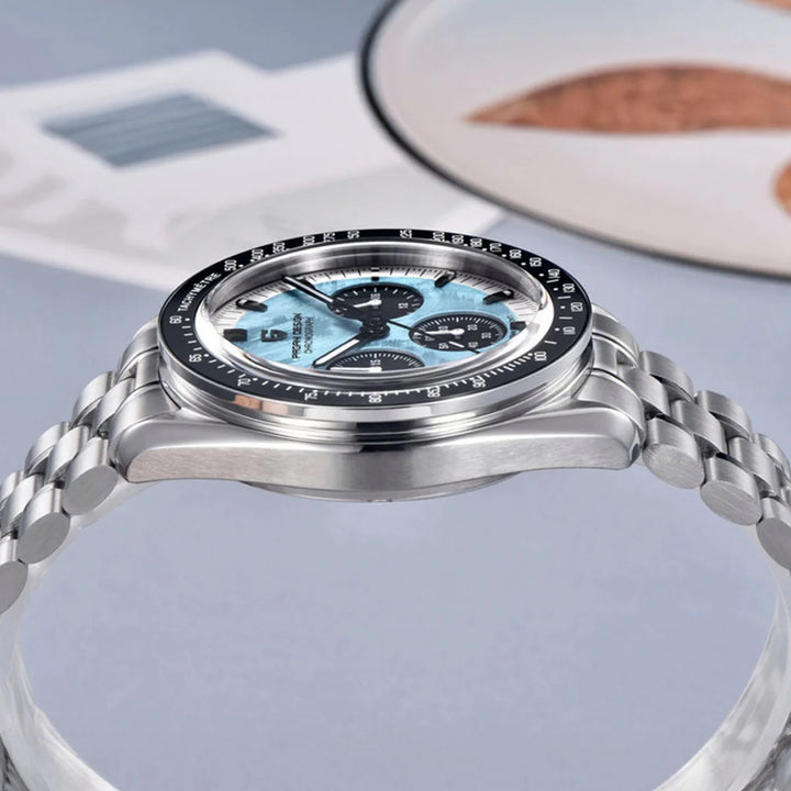 The Marchier Chrono Sky Blue blends bold sport aesthetics with refined craftsmanship. With 100m water resistance, it ensures confidence in every moment.