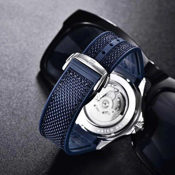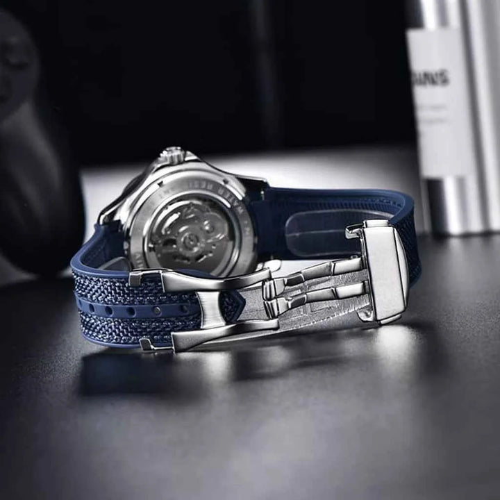 Its strap merges nylon and rubber for flexibility, while the case is crafted from 316L stainless steel, offering unmatched durability, corrosion resistance, and comfort. A piece designed to feel nearly weightless on your wrist.