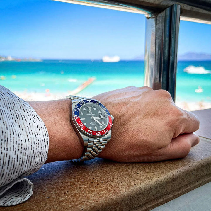 The Marchier Heritage Red & Blue stands out with its striking dual-tone bezel, blending iconic style with 100m water resistance for confidence in any setting.