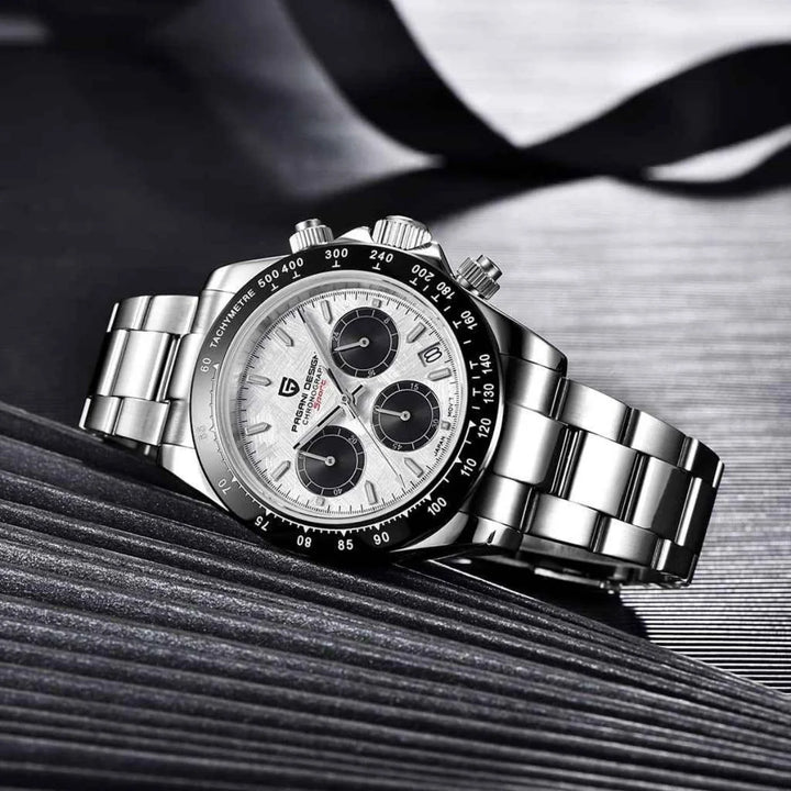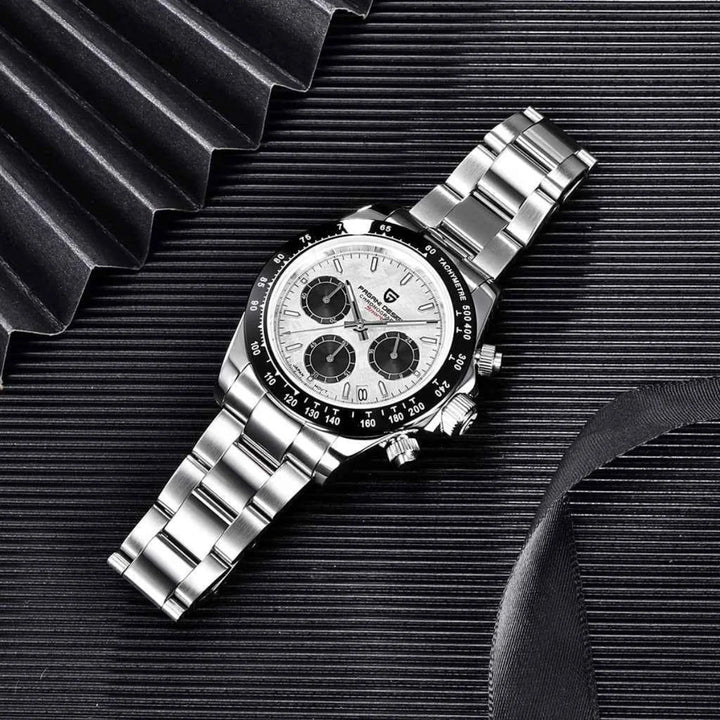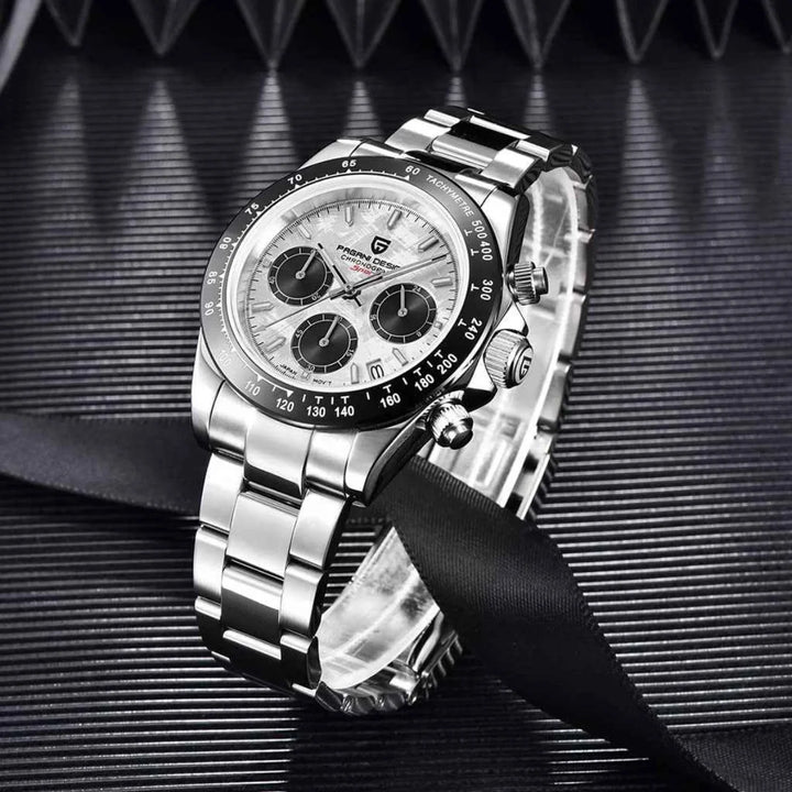 Powered by the Seiko VK63 quartz caliber, the Origin Silver ensures unmatched precision and reliability. The chronograph and tachymeter functions provide versatility and accuracy for all your needs.