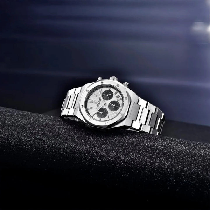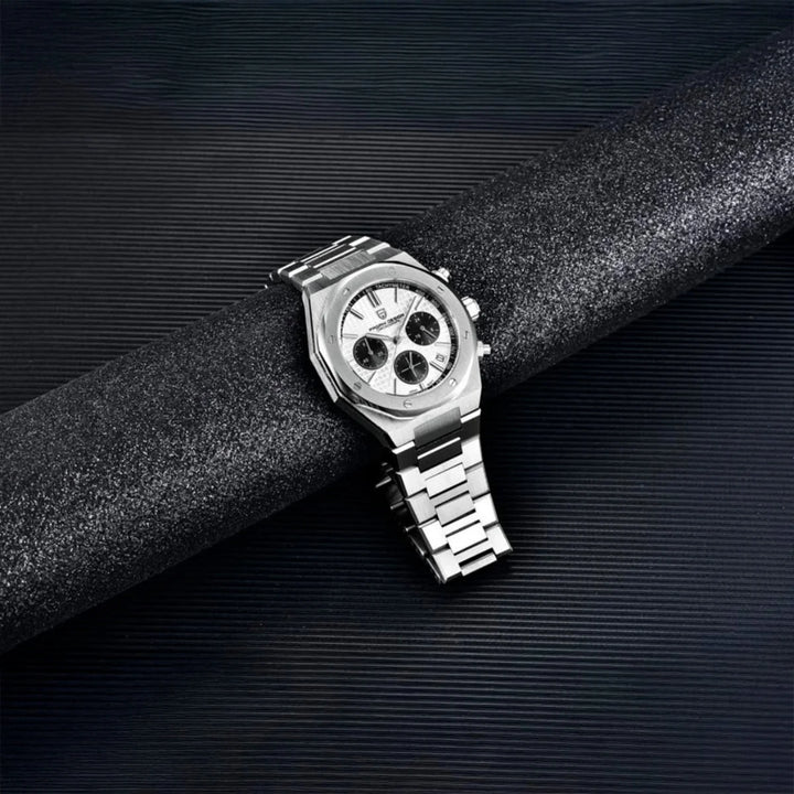 Powered by the Seiko VK63 quartz chronograph movement, the Perseus White provides precise timekeeping and smooth chronograph functionality. No power reserve required.