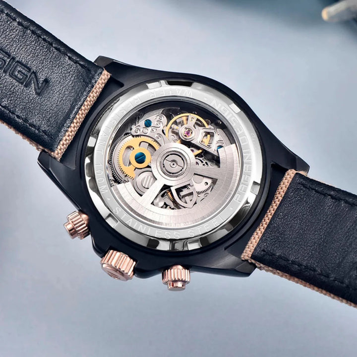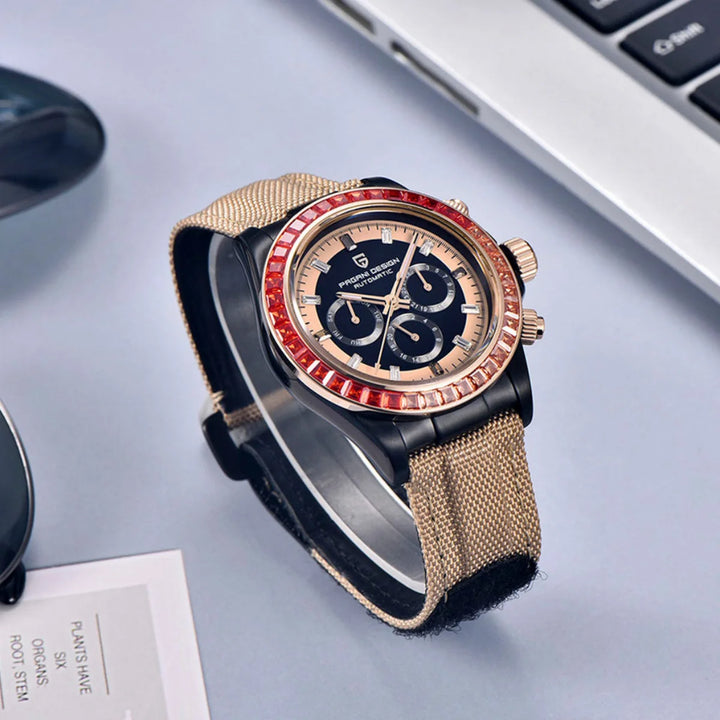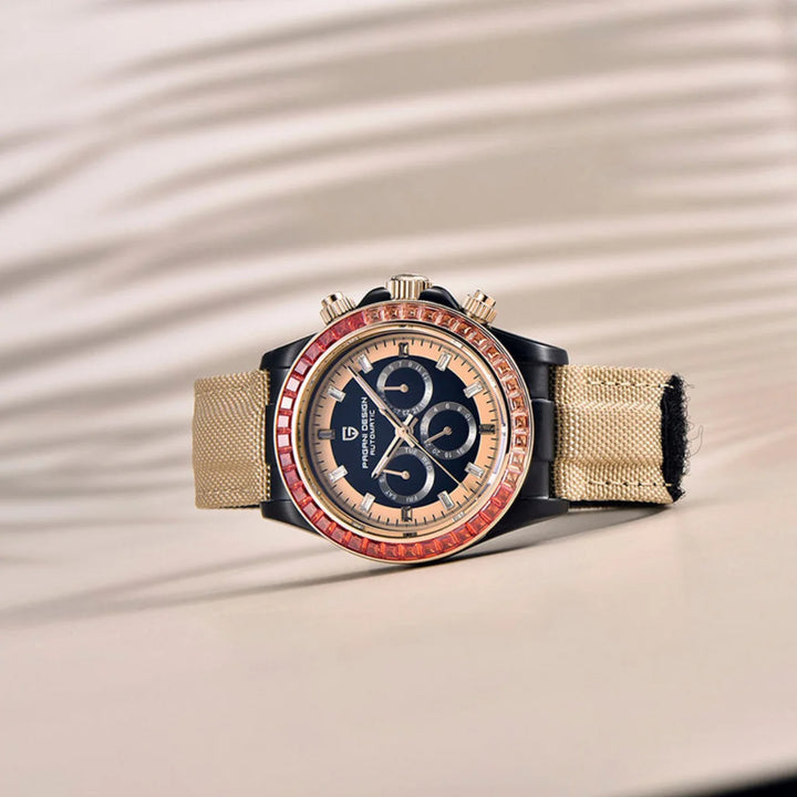 The case and details are crafted from 316L stainless steel, ensuring durability, corrosion resistance, and a polished finish. Its strap combines the resilience of nylon with the lightness of rubber for unmatched comfort.