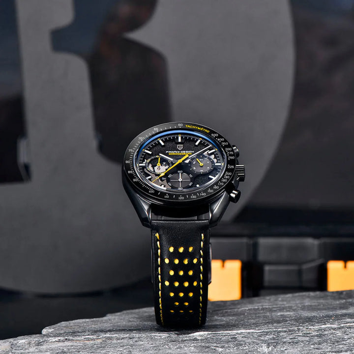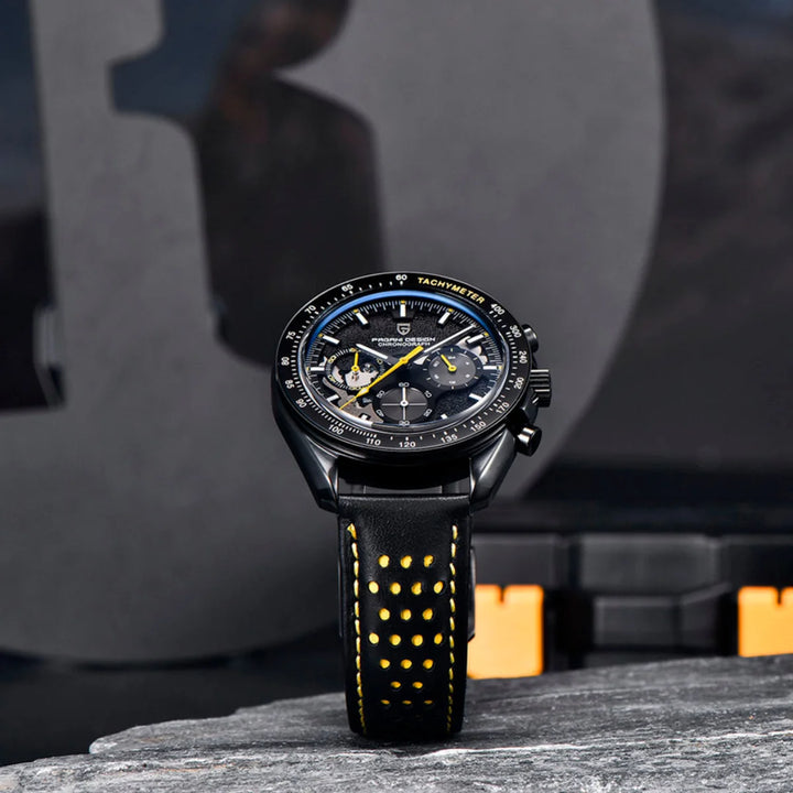 Powered by the Seiko VK63 quartz chronograph movement, the Solstice Yellow delivers unwavering accuracy and smooth performance. No power reserve (Quartz movement).