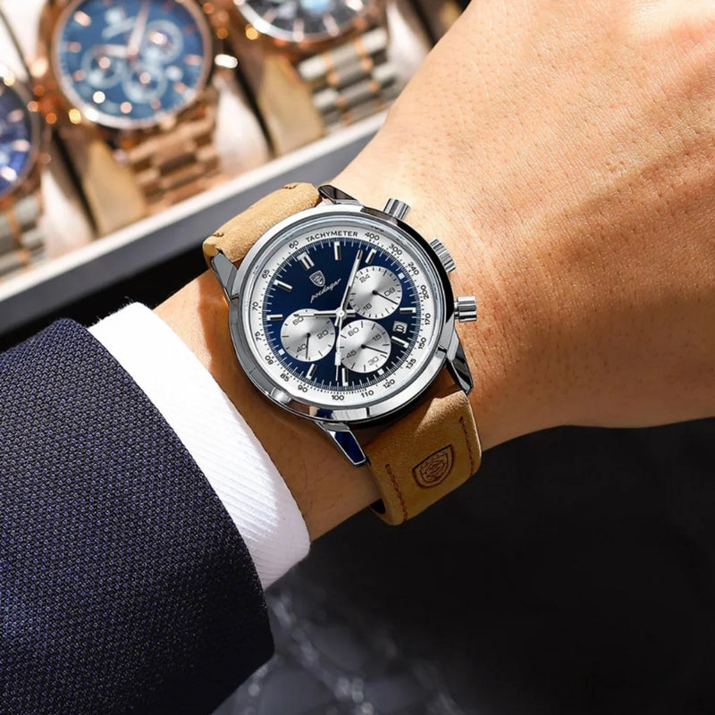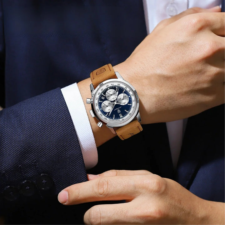 The Marchier Timeless Watch embodies the perfect balance between bold exploration and refined elegance. Its rounded 41mm case and sleek design exude confidence, making it the ideal companion for both professional and casual moments. With chronograph precision and full calendar functionality, it transforms every second into a statement of sophistication.